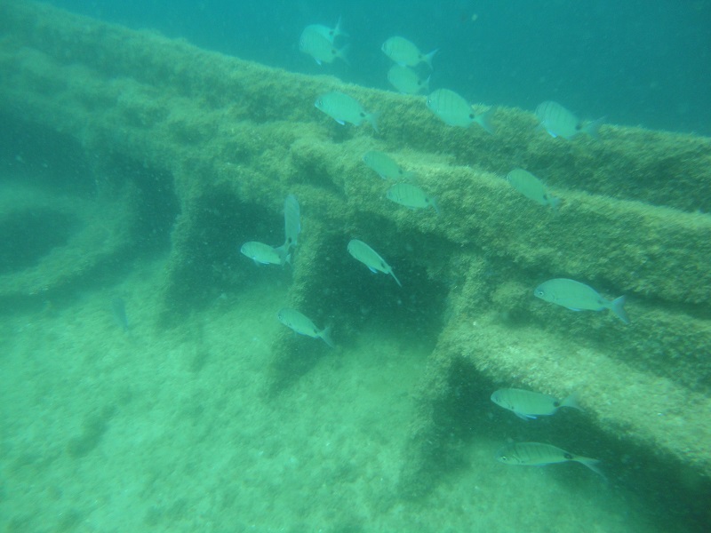 the small (30 m long) wreck lies at a depth of 10 m. This artificial reef serves as a home to many marine species such as octopi and cuttlefish. The wreck can be penetrated.